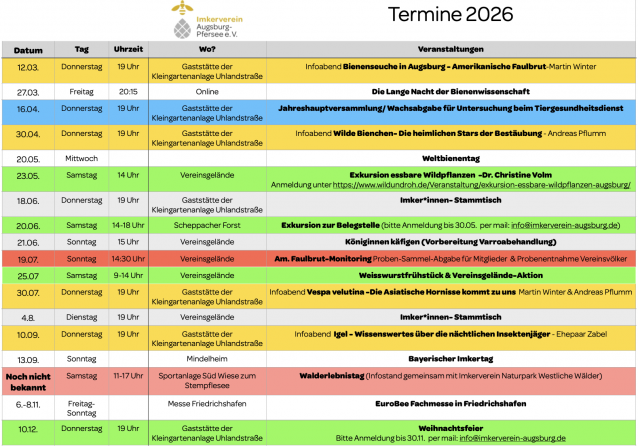 Mehrere Infoabende widmen wir wichtigen und hochaktuellen Themen: Von der amerikanischen Faulbrut in Augsburg, über Wildbienen und Igelschutz, bis hin zur asiatischen Hornisse, die voraussichtlich in diesem Jahr auch in Augsburg auftreten wird. Gut informiert lässt es sich schließlich deutlich entspannter imkern.